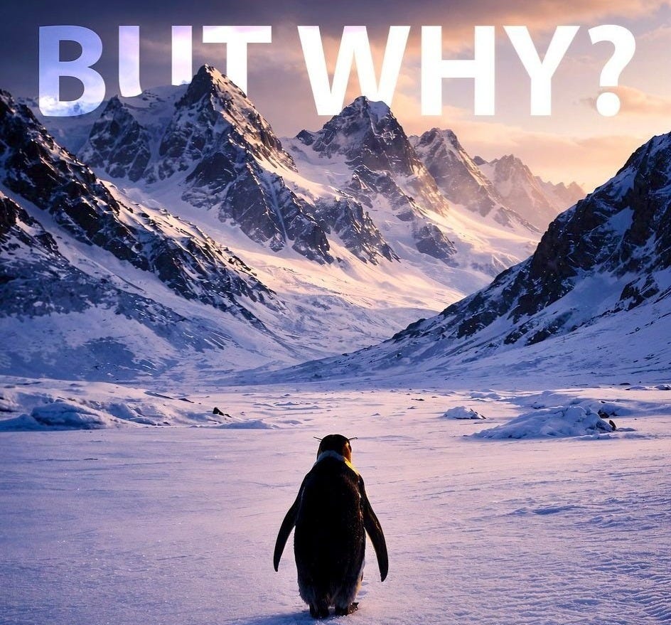 O pinguim representa o momento em que alguém recusa viver apenas no circuito conforto–recompensa. Ele encarna o "mais além" que não se explica. O "But why?" que não pede resposta, apenas permite a caminhada.